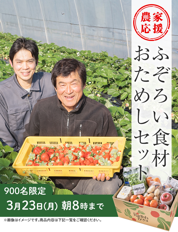 - らでぃっしゅぼーやの「ふぞろいおためしセット」は、初めての方のみ、1回限りのおためし価格でご利用いただけます。