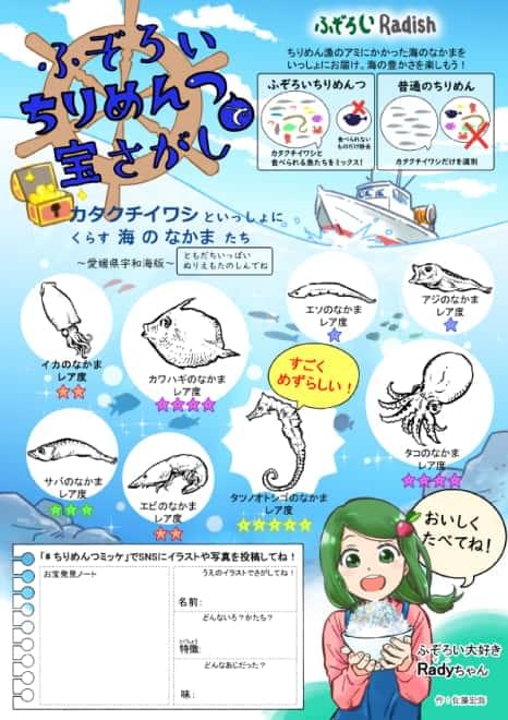 愛媛県西予市のちりめん漁で獲れる、カタクチイワシの仲間たちを塗り絵で楽しむコーナーです。愛媛県出身で地元ゆかりの漫画家、佐藤宏海さんによる描きおろしの塗り絵をダウンロードしてお楽しみください。