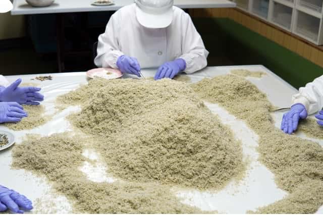 A ちりめんは、まとめて湯がいて干してから、選別します。従業員5人ぐらいで目視選別、さらにそれを2回繰り返して選別します。