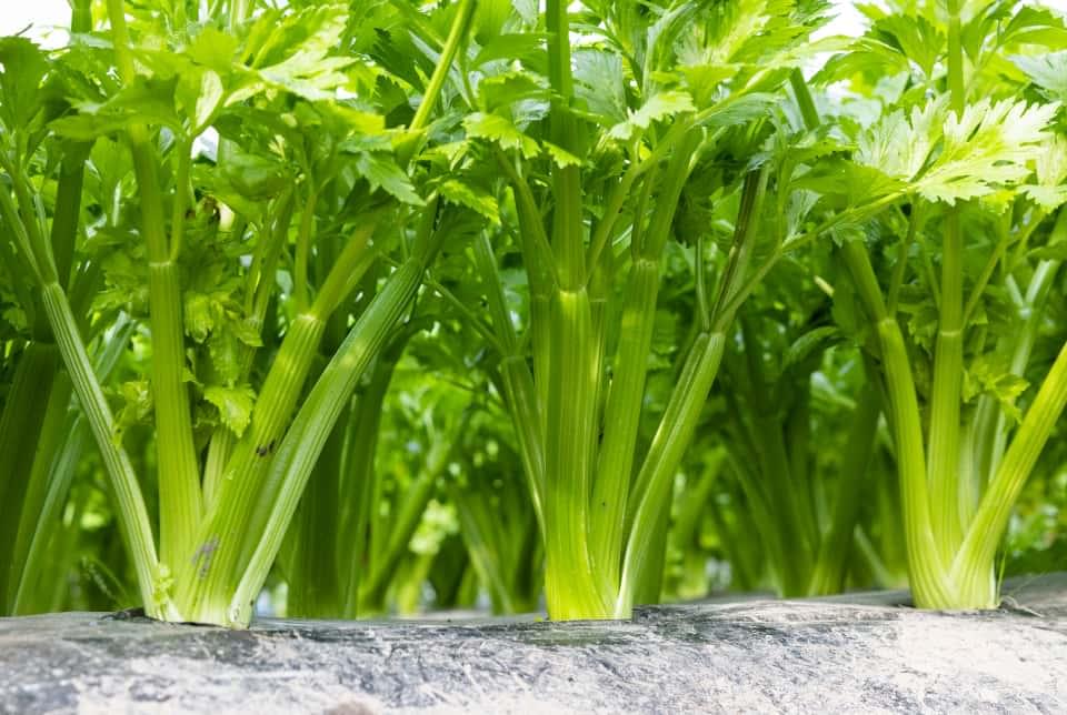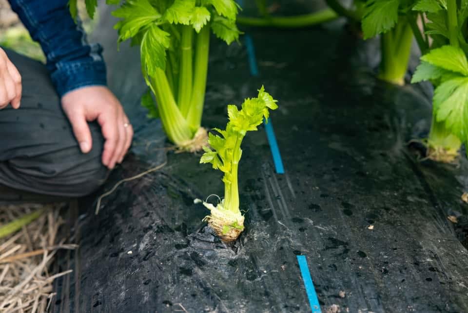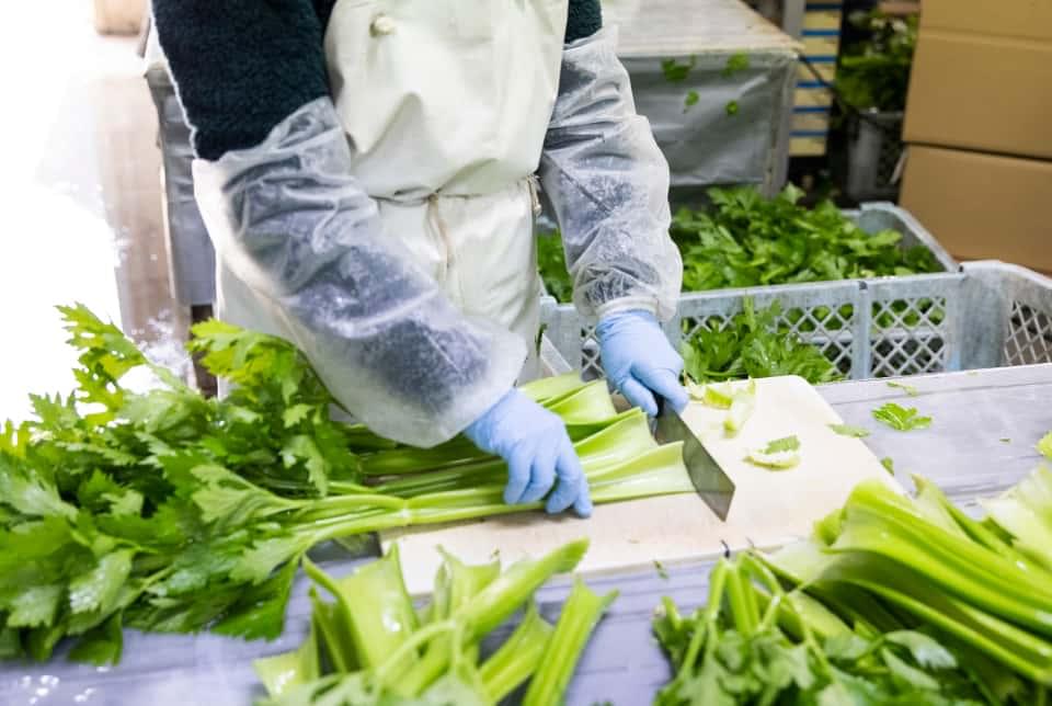 丁寧に育てられたセロリ収穫後の畑には、幼い葉を茂らせた株元の芯が残ります。それらは通常は全て廃棄され、8棟全てのハウスを合算すると膨大な量になるそう。
