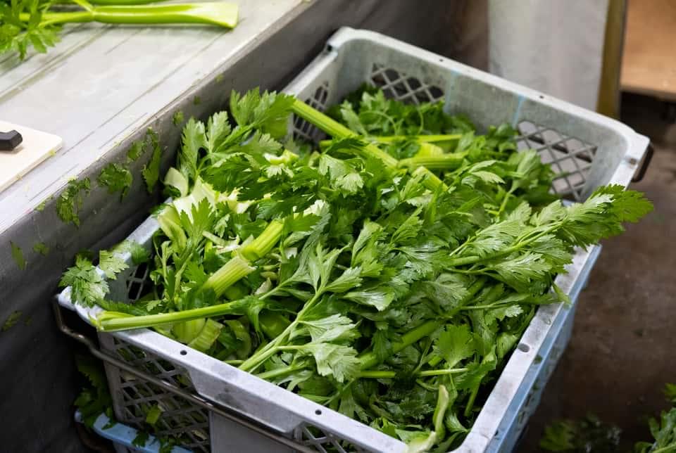 茎の端をカットして綺麗に整え、袋に収まりきらない葉先もカット。それらは「綺麗に整えたセロリ」の副産物として、作業台の脇に置いてある大きなケースにどんどん放り込まれていきます。ある程度まとまった量のセロリを出荷する段階になると、軽トラ1杯分もの量になるそう。