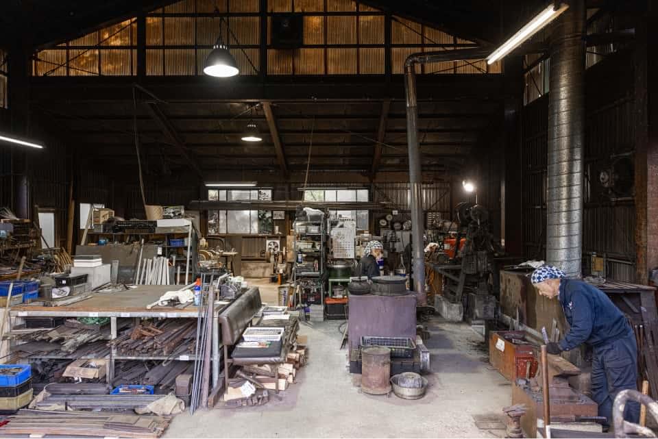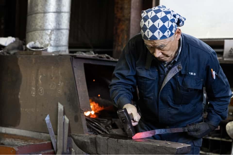 店舗からほど近い工房では、叩くことで不純物を取り除きながら成形する鍛造(たんぞう)が行われていました。黙々と仕事に打ち込むのは3代目の勝治さん。赤々と燃える松炭の香ばしい匂いが立ちこめるなか、煌々と色づいた鋼が火花を散らしながら打ち伸ばされていきます。