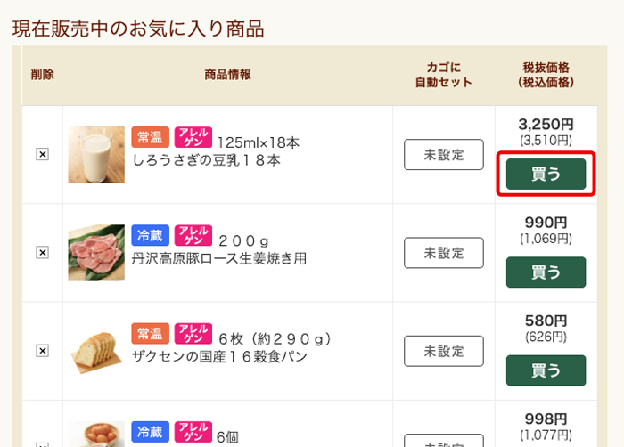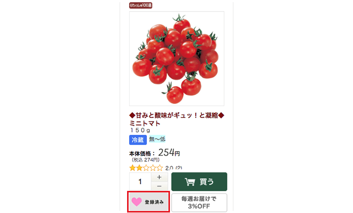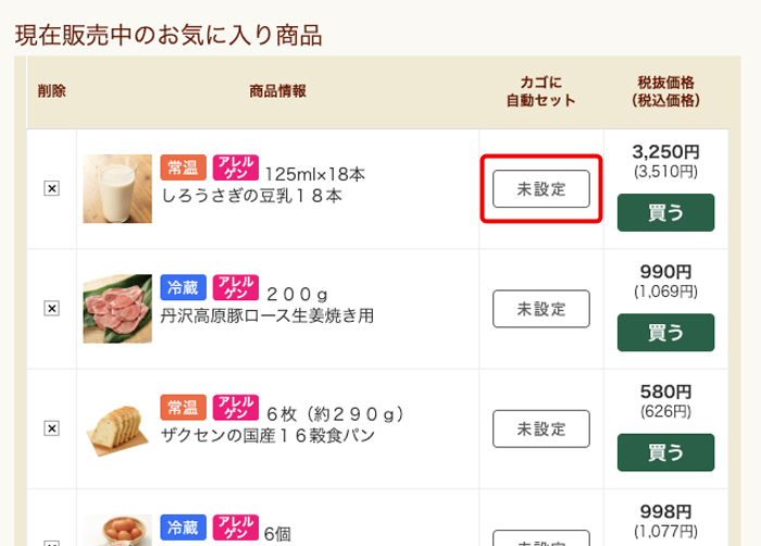 定期宅配サービスをご利用の方は、お気に入り登録された商品が販売される週には、自動でお買い物カゴにセットされるように設定することも可能です。