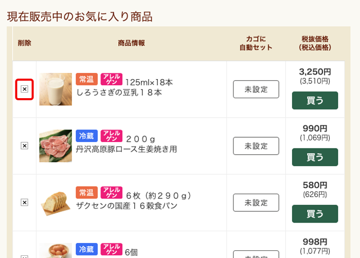お気に入り商品から削除したい場合は、商品名左の【削除】ボタンを押してください。