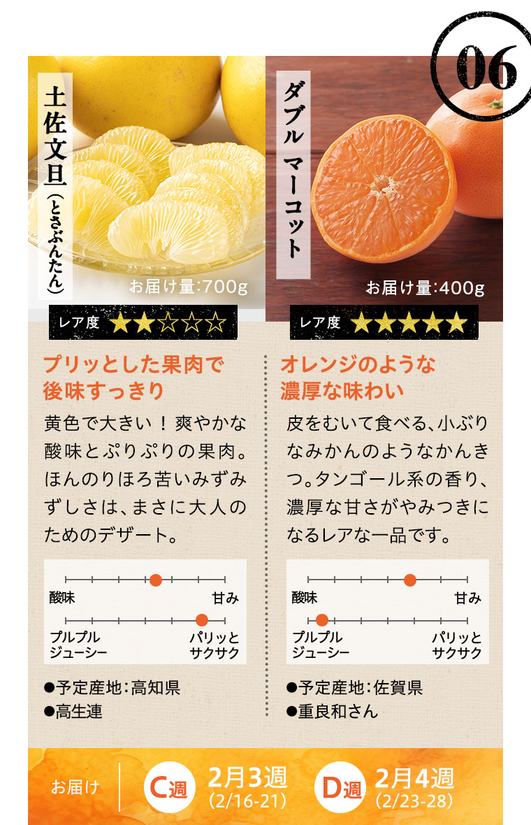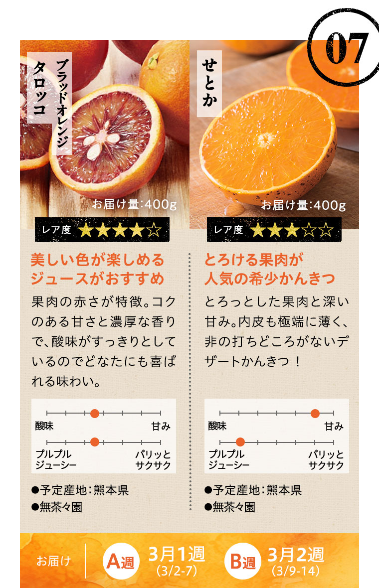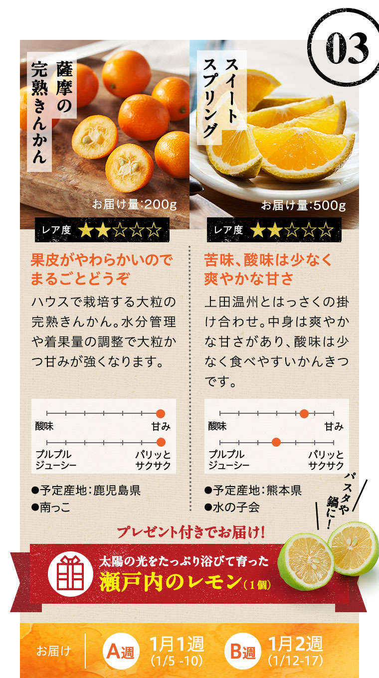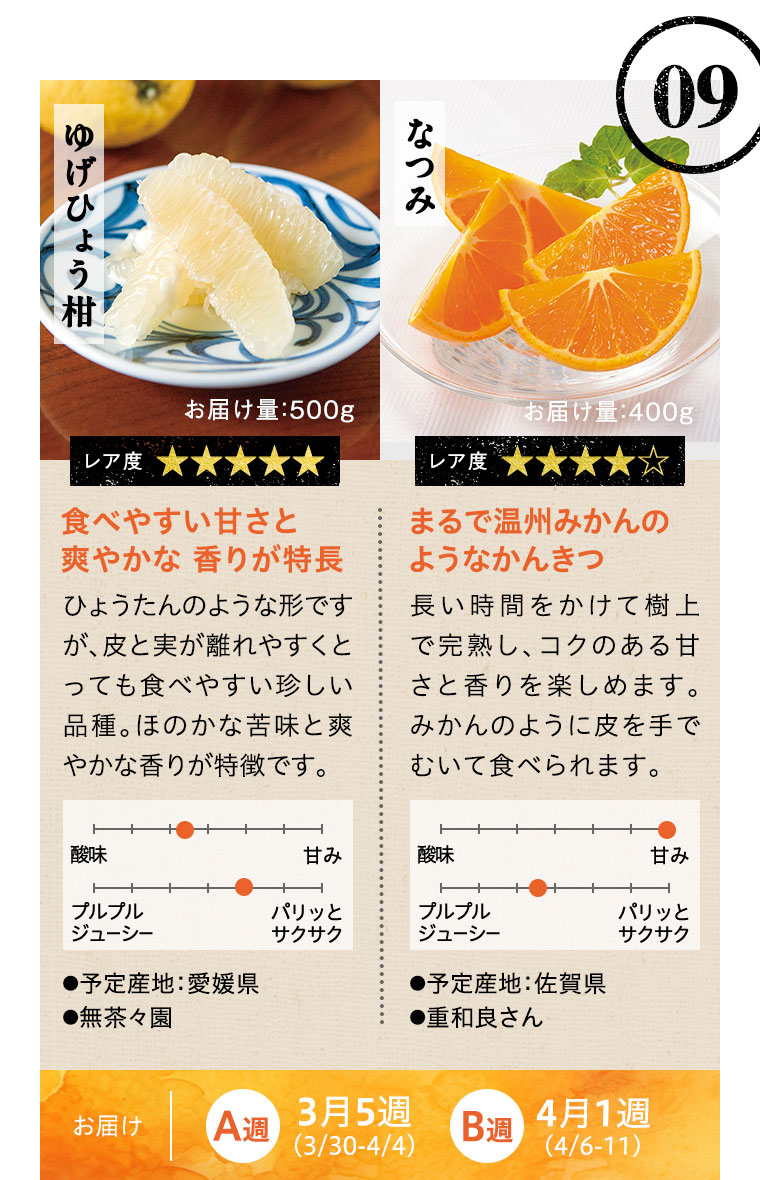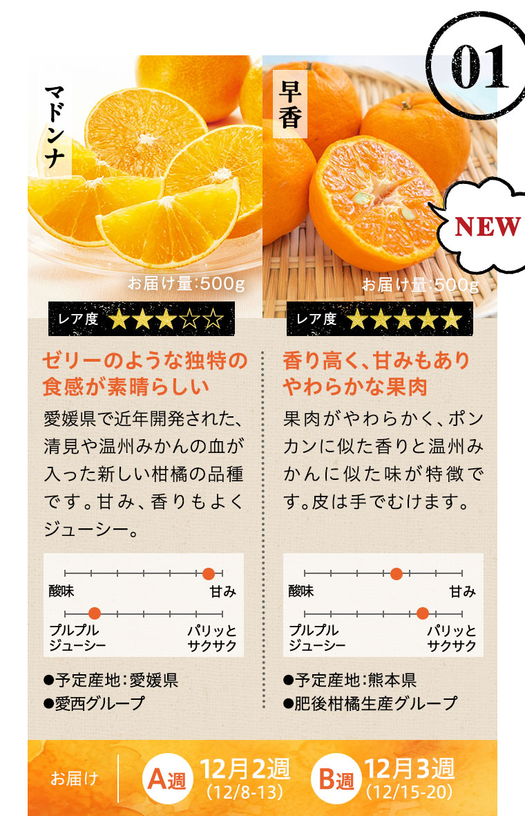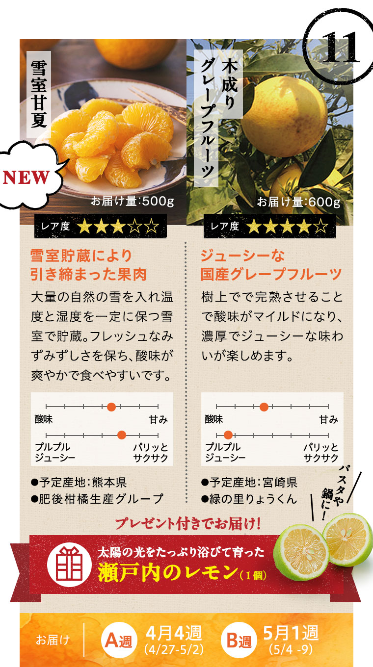 ※天候などの状況により、お届け週、お届けする品種、お届け量目などが変更になる場合があります。また、お届けが延期になる場合や、欠品となる場合もありますので、あらかじめご了承ください。