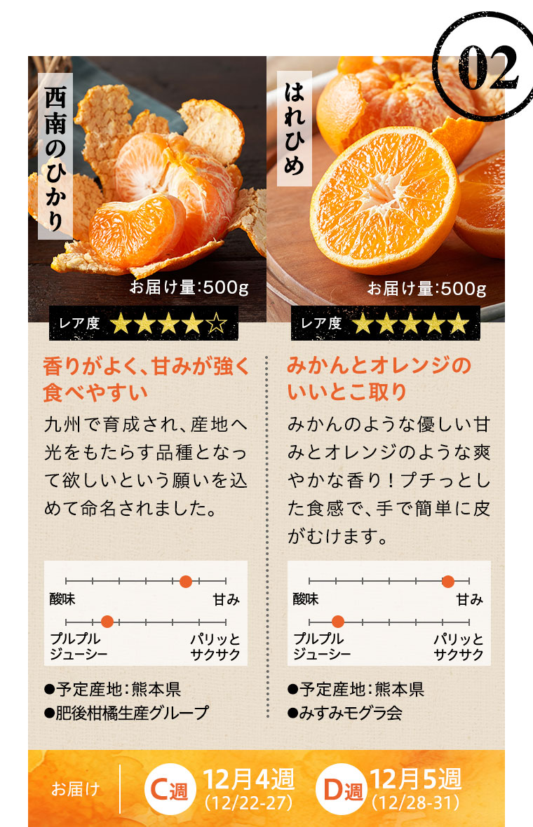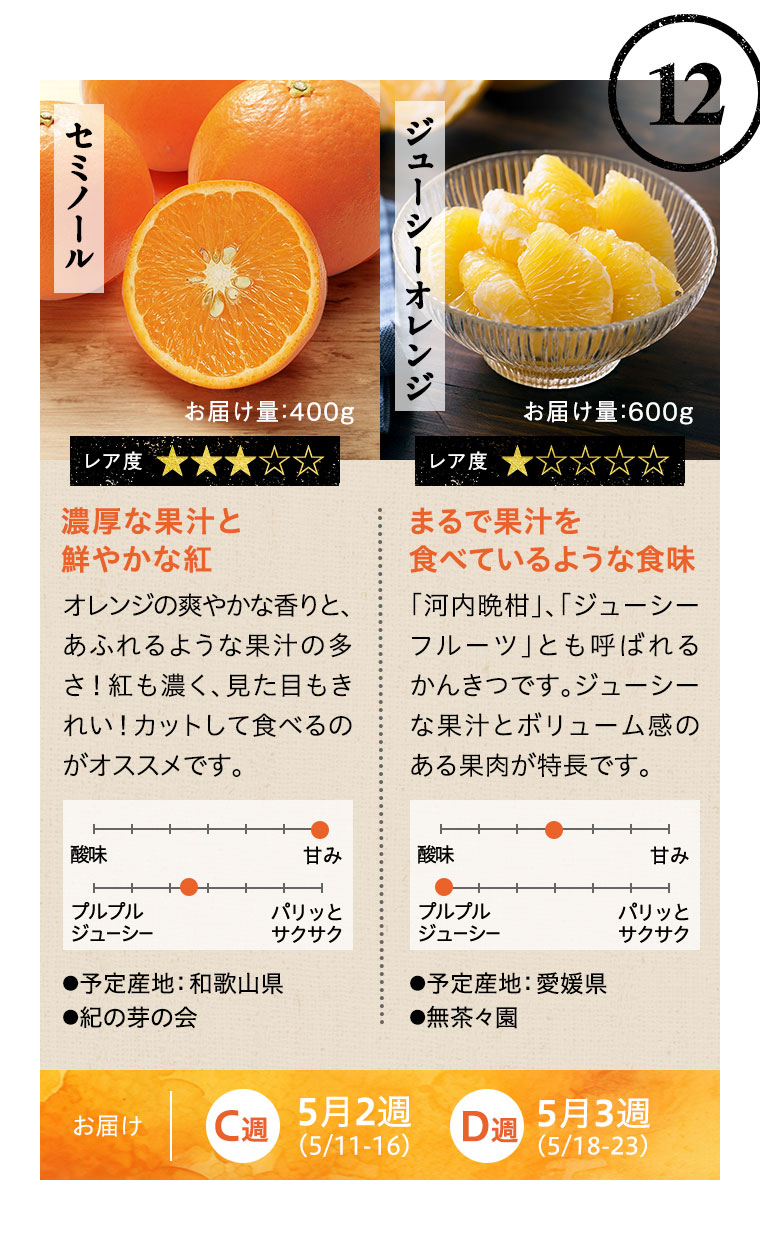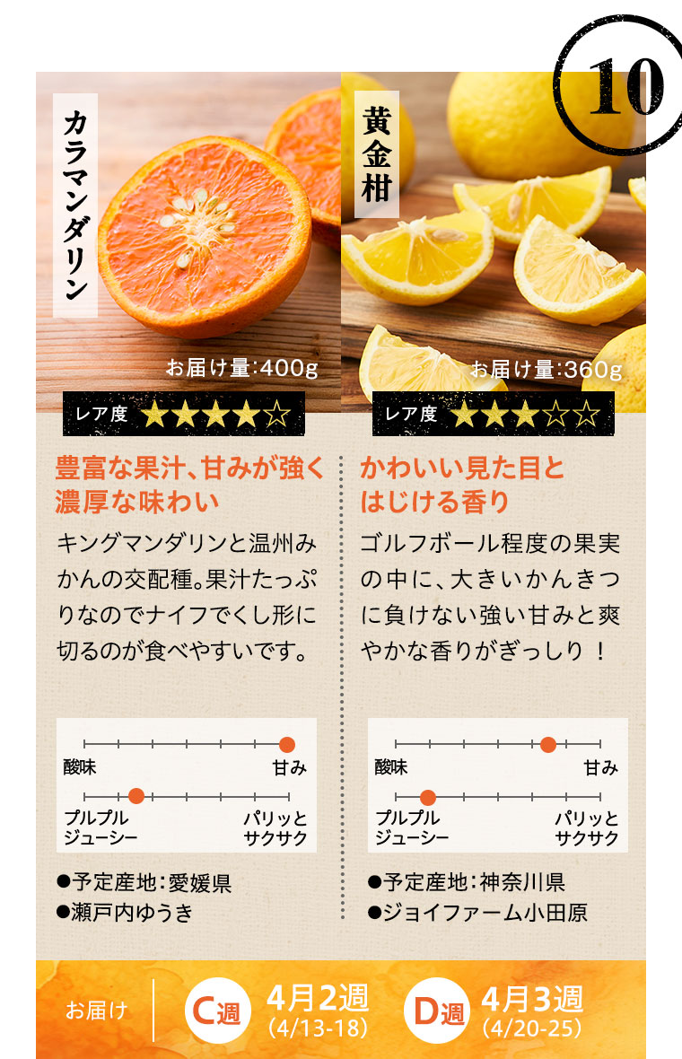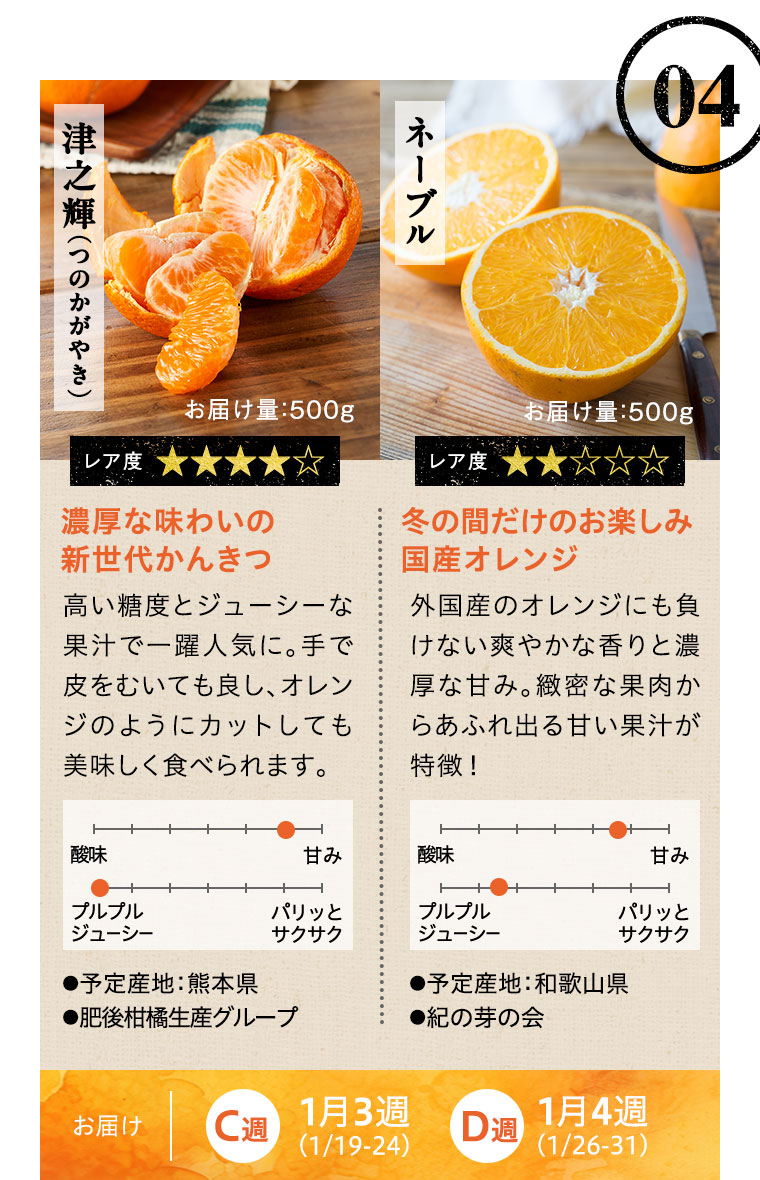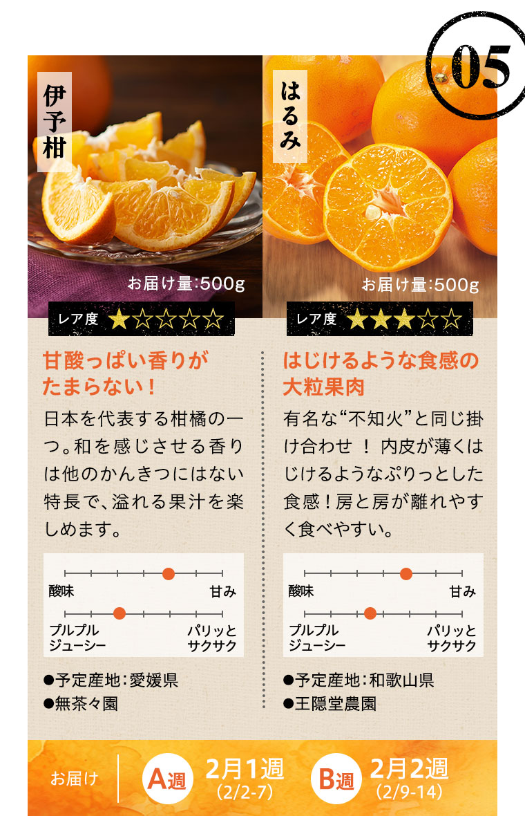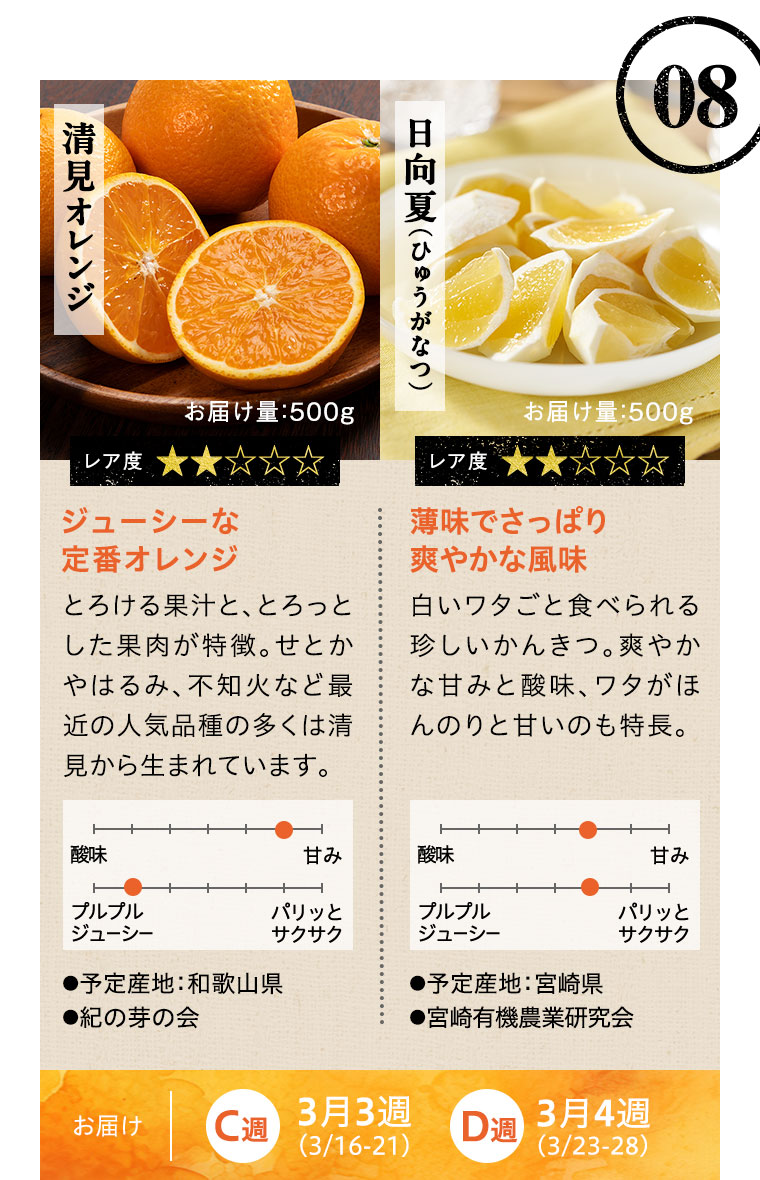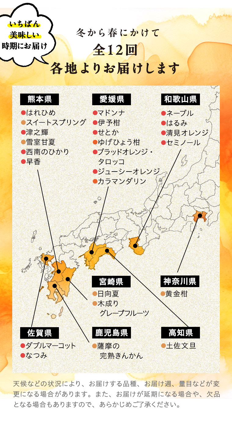 ※天候などの状況により、お届け週、お届けする品種、お届け量目などが変更になる場合があります。また、お届けが延期になる場合や、欠品となる場合もありますので、あらかじめご了承ください。