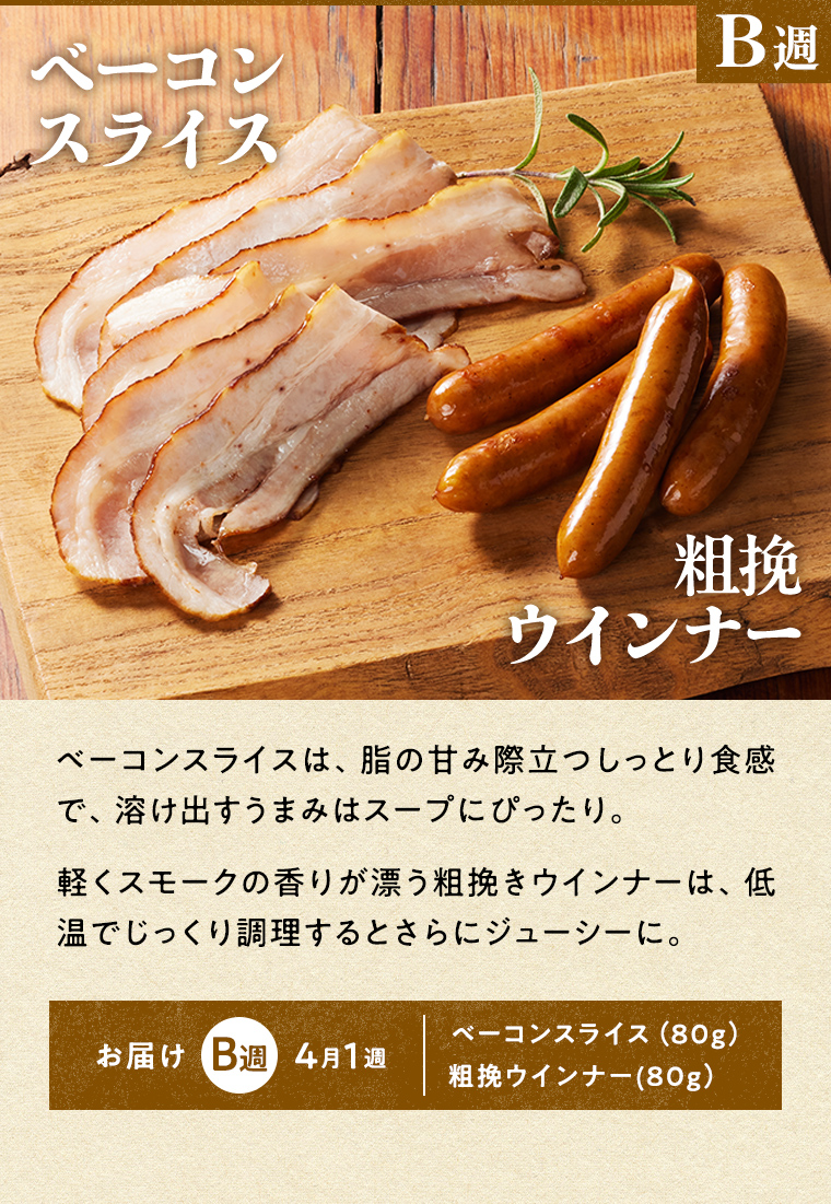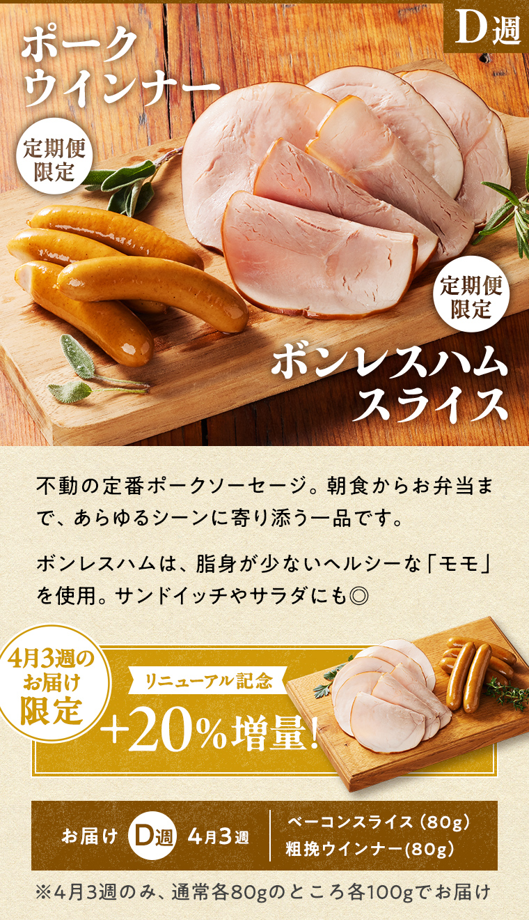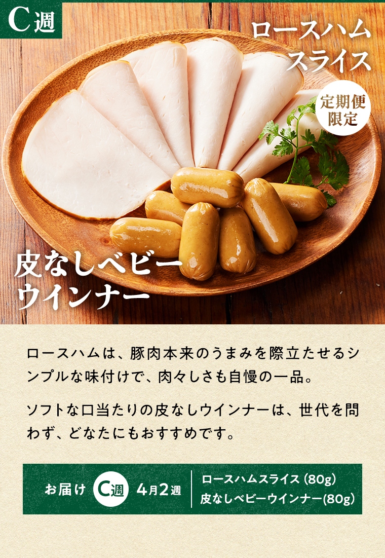 4週間をひとつのサイクルとしてお届けしており、1週間ごとにA・B・C・Dの記号で表しています。商品によってそれぞれ設定されていますので、「お届け週」の項目を確認ください。