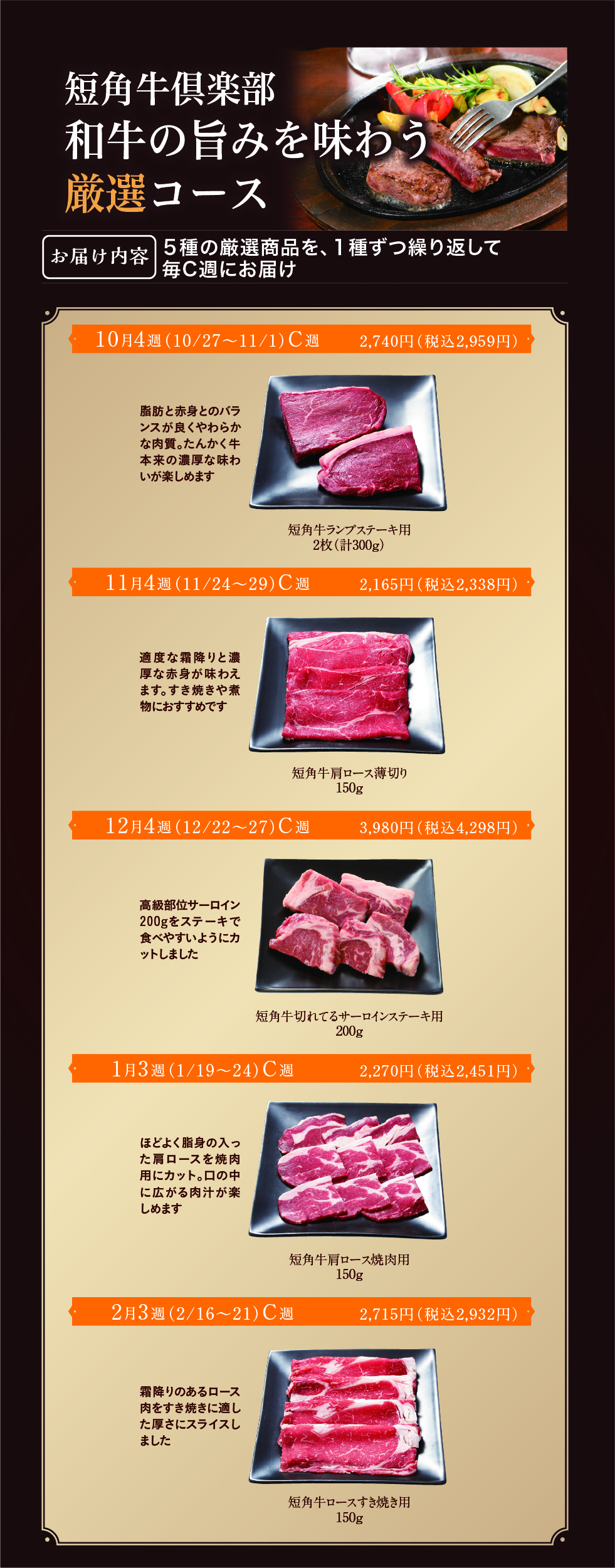 4週間をひとつのサイクルとしてお届けしており、1週間ごとにA・B・C・Dの記号で表しています。商品によってそれぞれ設定されていますので、「お届け週」の項目を確認ください。